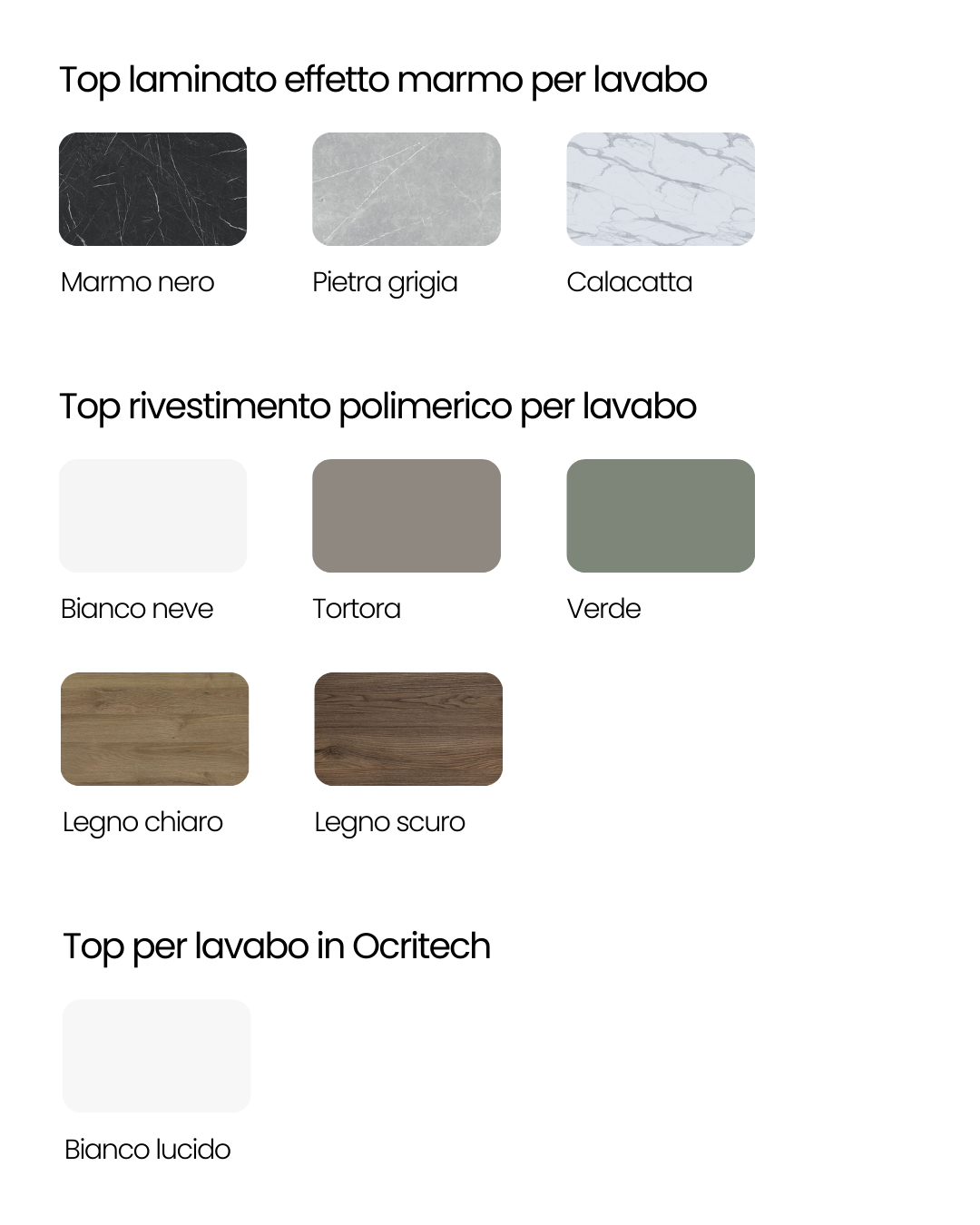 Top lavabo bianco,Top lavabo tortora,Top lavabo verde,Top lavabo legno chiaro,Top lavabo legno scuro,Top lavabo in ocritech,Top lavabo effetto marmo calacatta,Top lavabo effetto marmo pietra grigia,Top lavabo effetto marmo nero