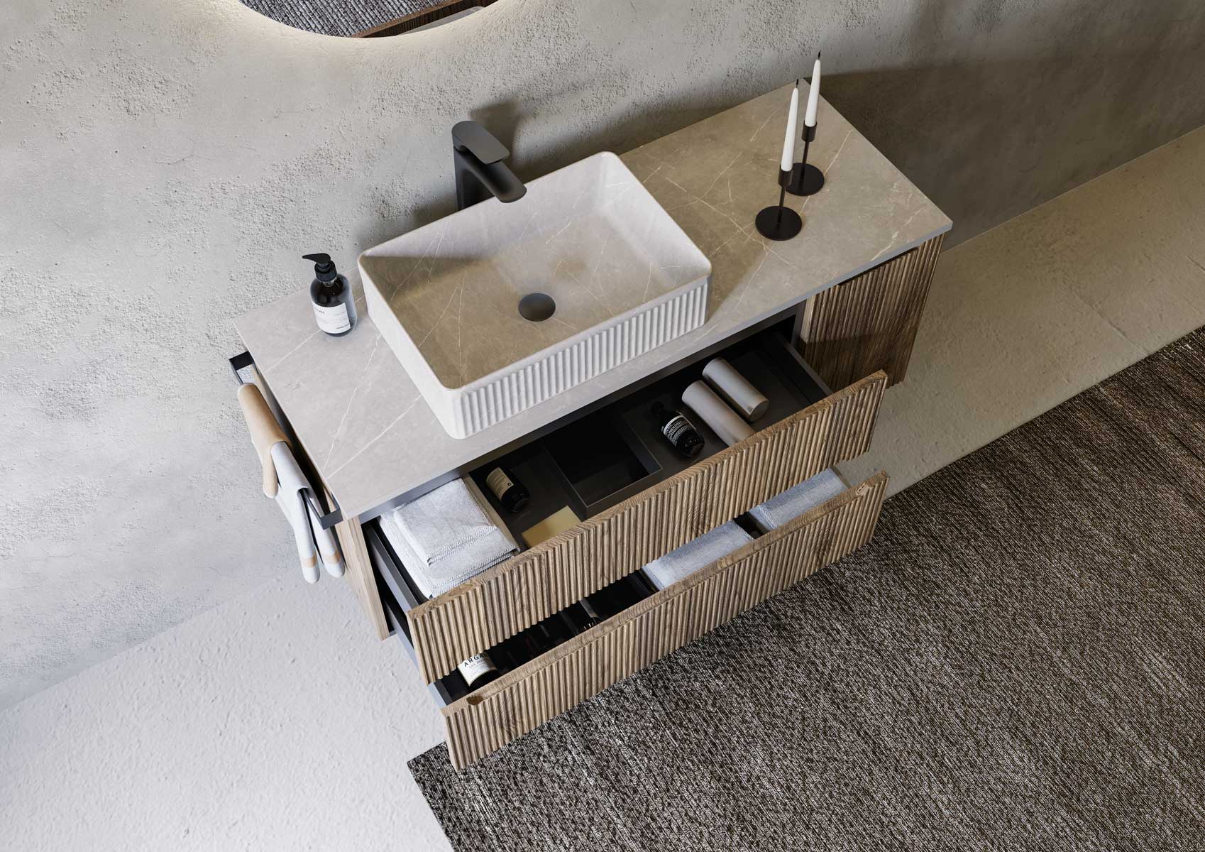 Il set bagno KIVRA combina funzionalità e design contemporaneo in una composizione elegante e curata nei dettagli. Ideale per ambienti moderni, unisce estetica raffinata e massima praticità, offrendo una soluzione completa e ben strutturata.