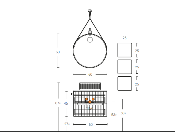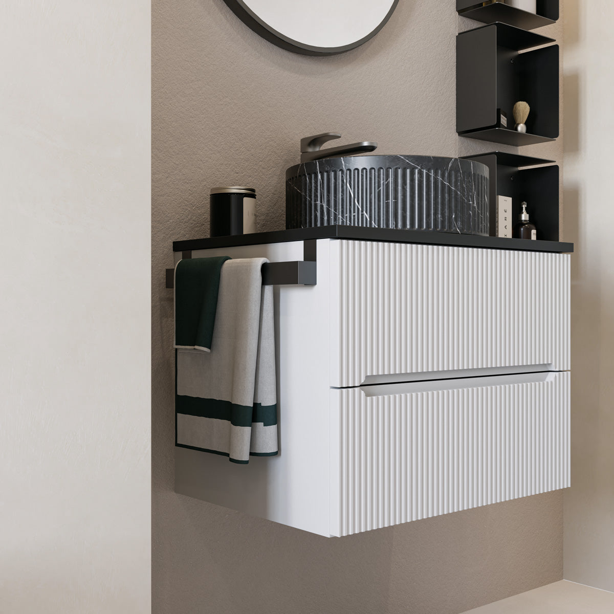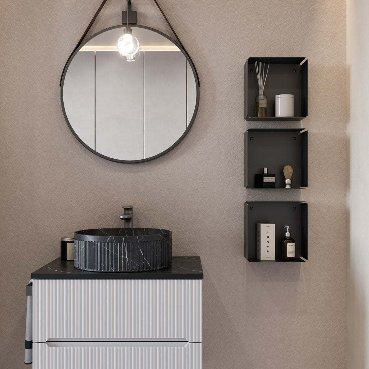 Una base portalavabo 2 cassetti L60 P460 H450, portasciugamano laterale nero L380 P50 H40, top lavabo in laminato L60 P460 H20, lavabo rigato tondo effetto marmo L375 P375 H130, specchio circolare con cinturino diametro 690 mm, lampada Ballon con supporto per montaggio a parete e foro per lavabo in appoggio.